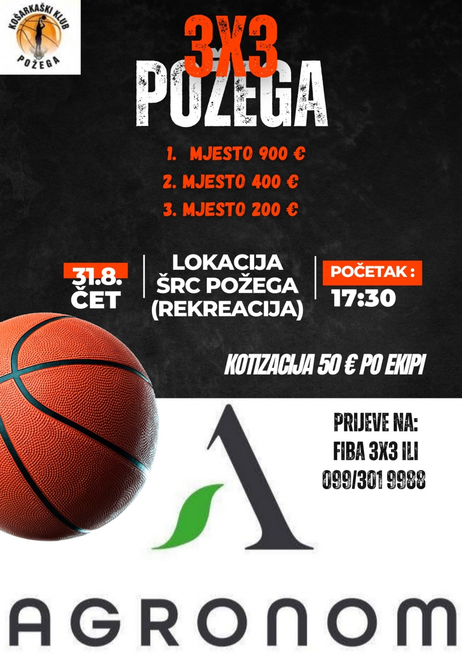 Košarkaški turnir 3x3 Požega održat će se u četvrtak, 31. kolovoza s početkom u 17,30 sati na Sportsko - rekreacijskom centru