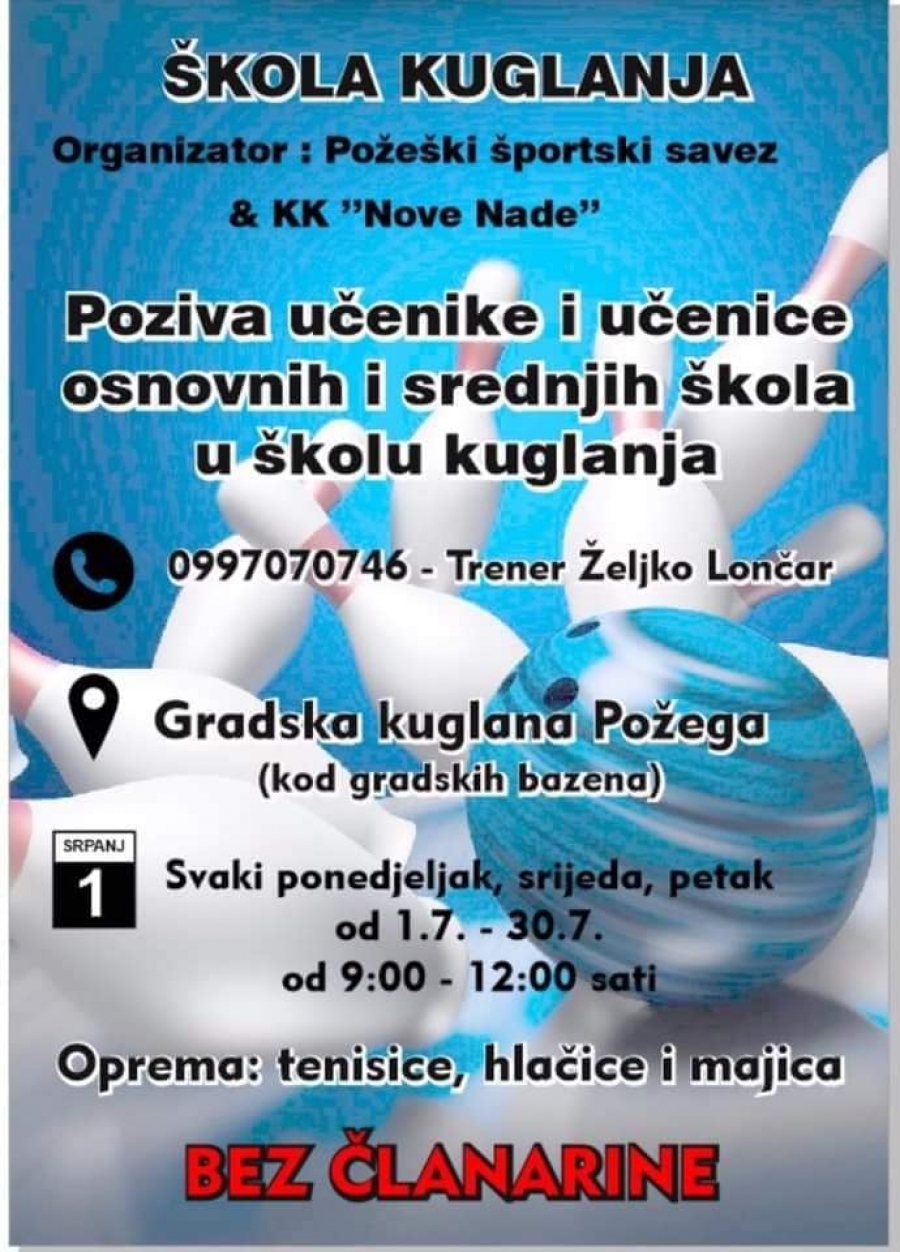 Škola kuglanja Požeškog športskog saveza i Kuglačkog kluba Nove nade održat će se od 01. do 30. srpnja na Gradskoj kuglani