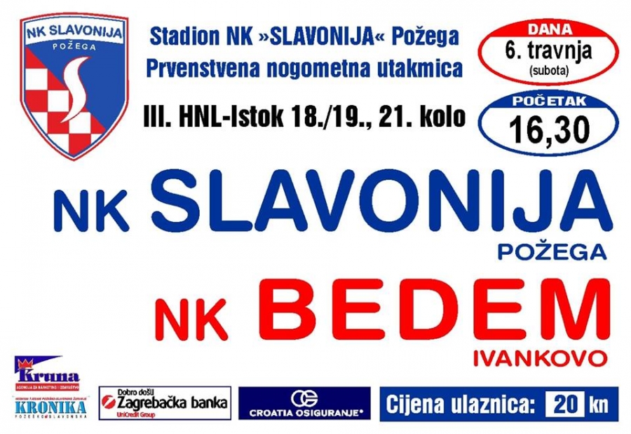 Slavonija u subotu, 06. 04. 2019. s početkom u 16,30 sati dočekuje NK Bedem (Ivankovo) u 21. kolu 3. HNL - Istok