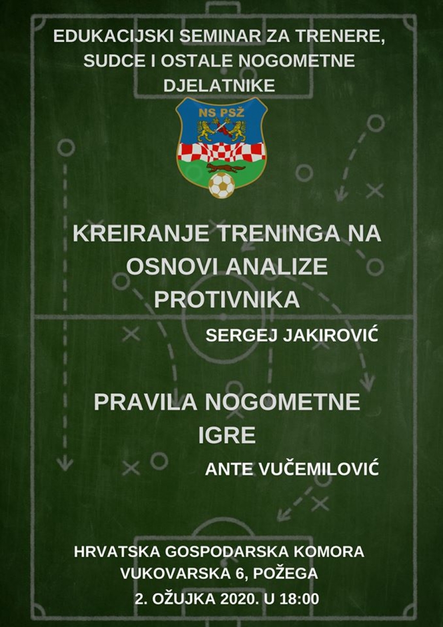 Edukacijski nogometni seminar održat će se u ponedjeljak, 02.03.2020. u 18,00 sati u Hrvatskoj gospodarskoj komori u Požegi