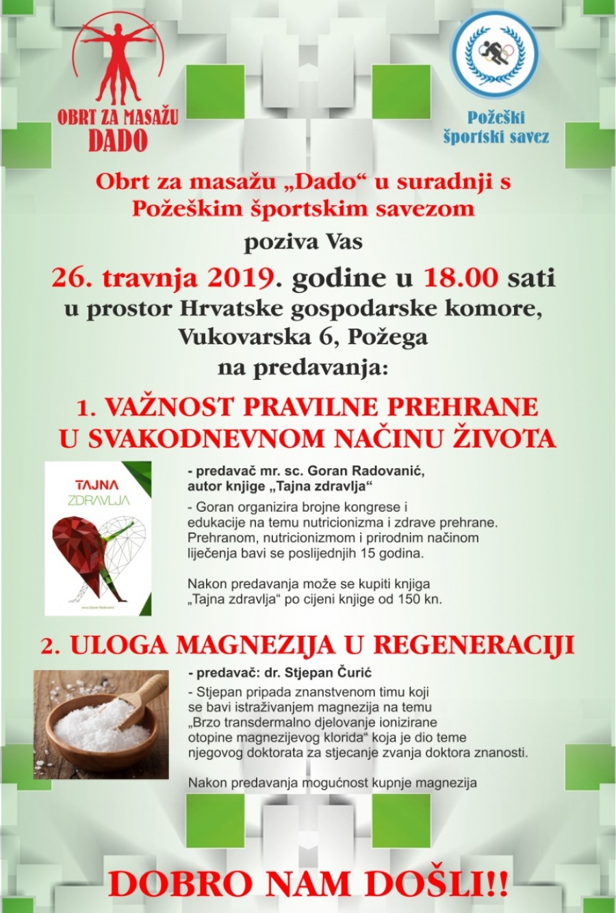 Požeški športski savez i Obrt za masažu "Dado" u petak, 26. 04. 2019. organiziraju predavanje o pravilnoj prehrani i ulozi magnezija u regeneraciji