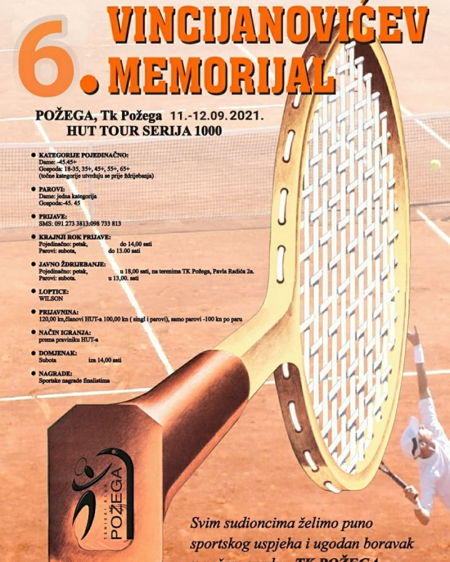 Narednog vikenda na igralištima Teniskog kluba Požega održat će se 6. Vincijanovićev memorijal